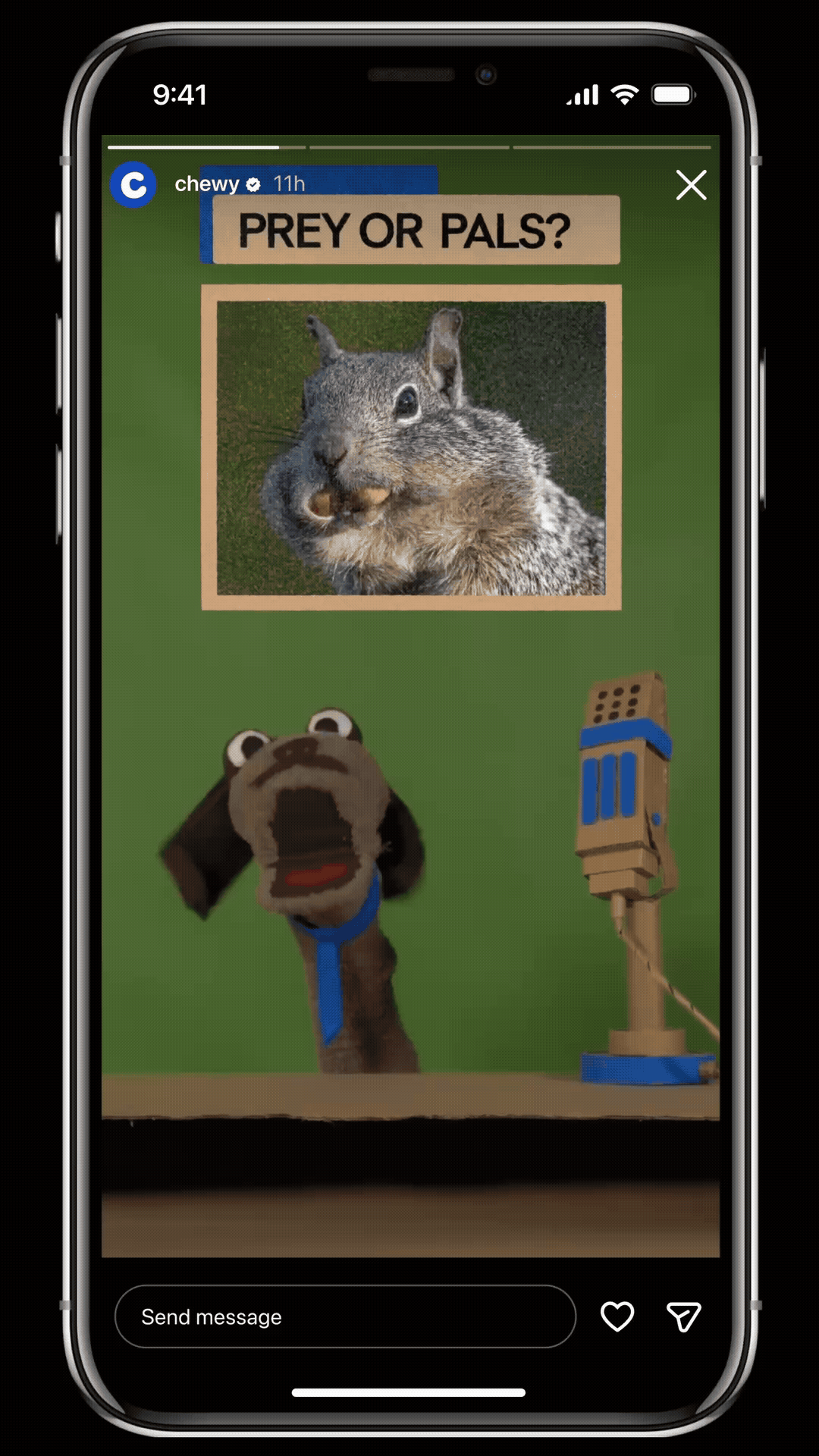 Along with creating the props and managing set design, I ensured the design and production of PNN was justified from both a consumer and brand perspective. Choosing to create a puppet show with homemade cardboard props and an un-edited green screen gave the feeling of a pet’s POV, and the DIY nature of using Chewy boxes aligns with current Chewy social posts.