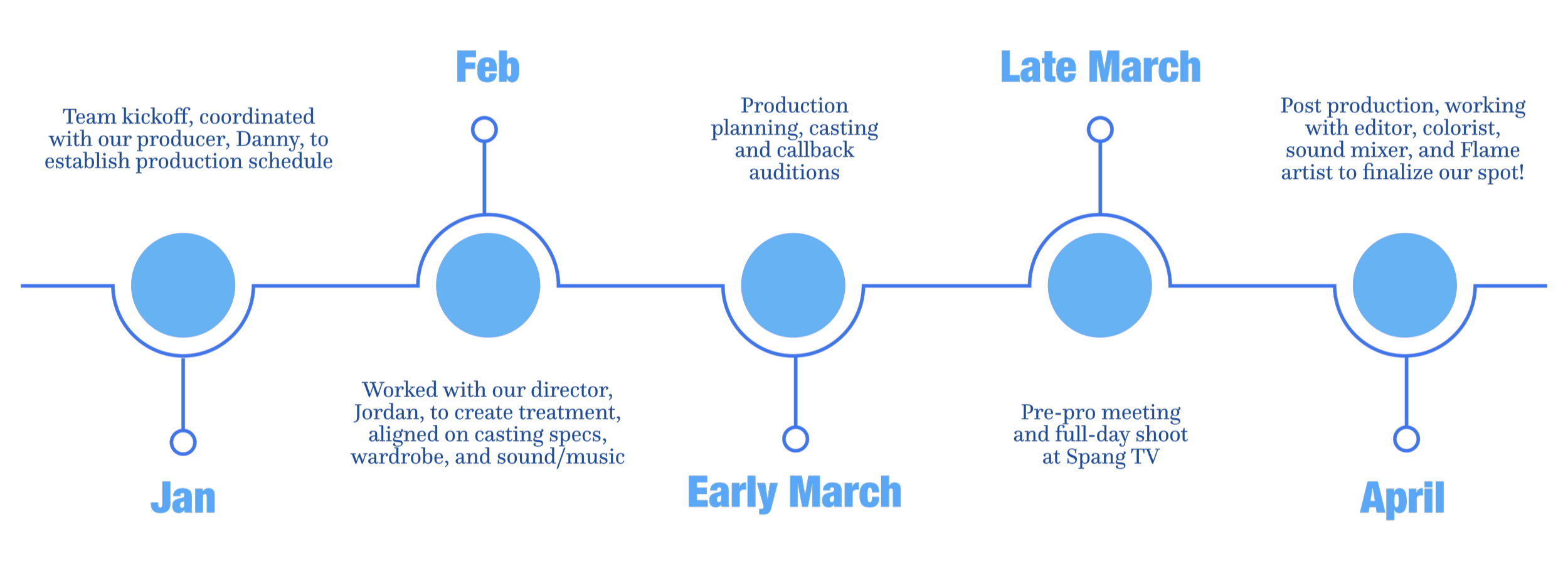 This spring semester, I was so kindly asked by three Brandcenter creatives to help bring their original Ice Breakers script to life, working with a local director and production team. We are currently in the post-production phase, finalizing the edit and moving onto color, sound, and flame. I can’t wait to show the final product!